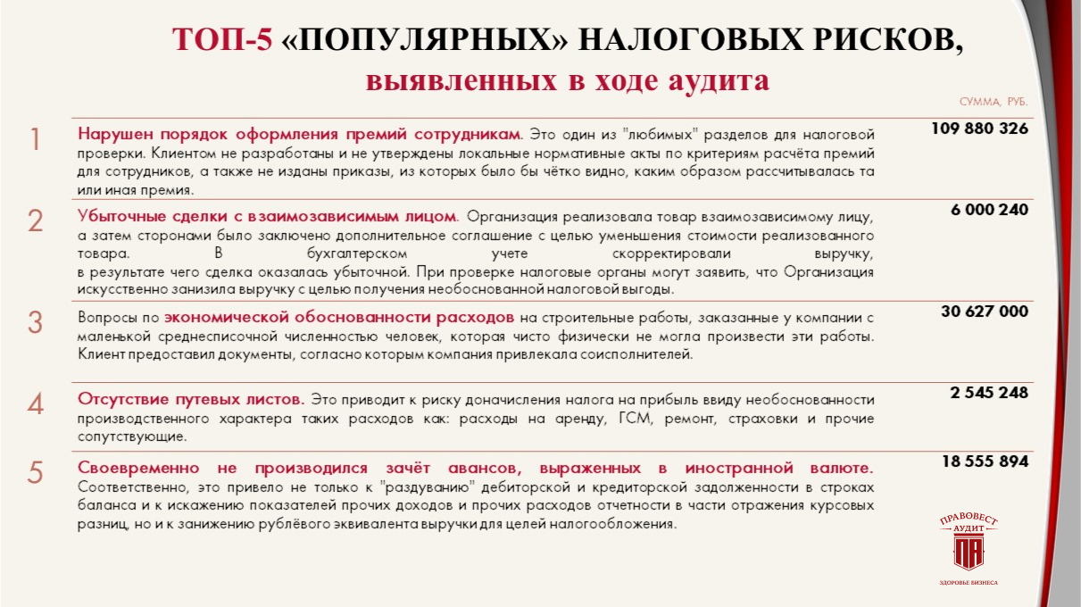 Большинство аудиторских проверок «Правовест Аудит» выявляет ощутимые налоговые риски.