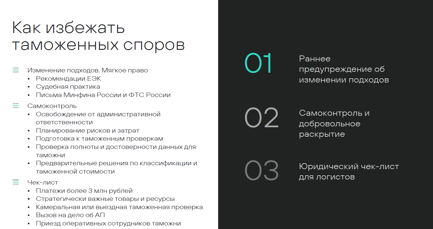 - Знать, когда обращаться к юристам: при риске доначислений свыше 3 млн рублей, при ввозе стратегически важных товаров или при вызове на допрос в таможенные органы.