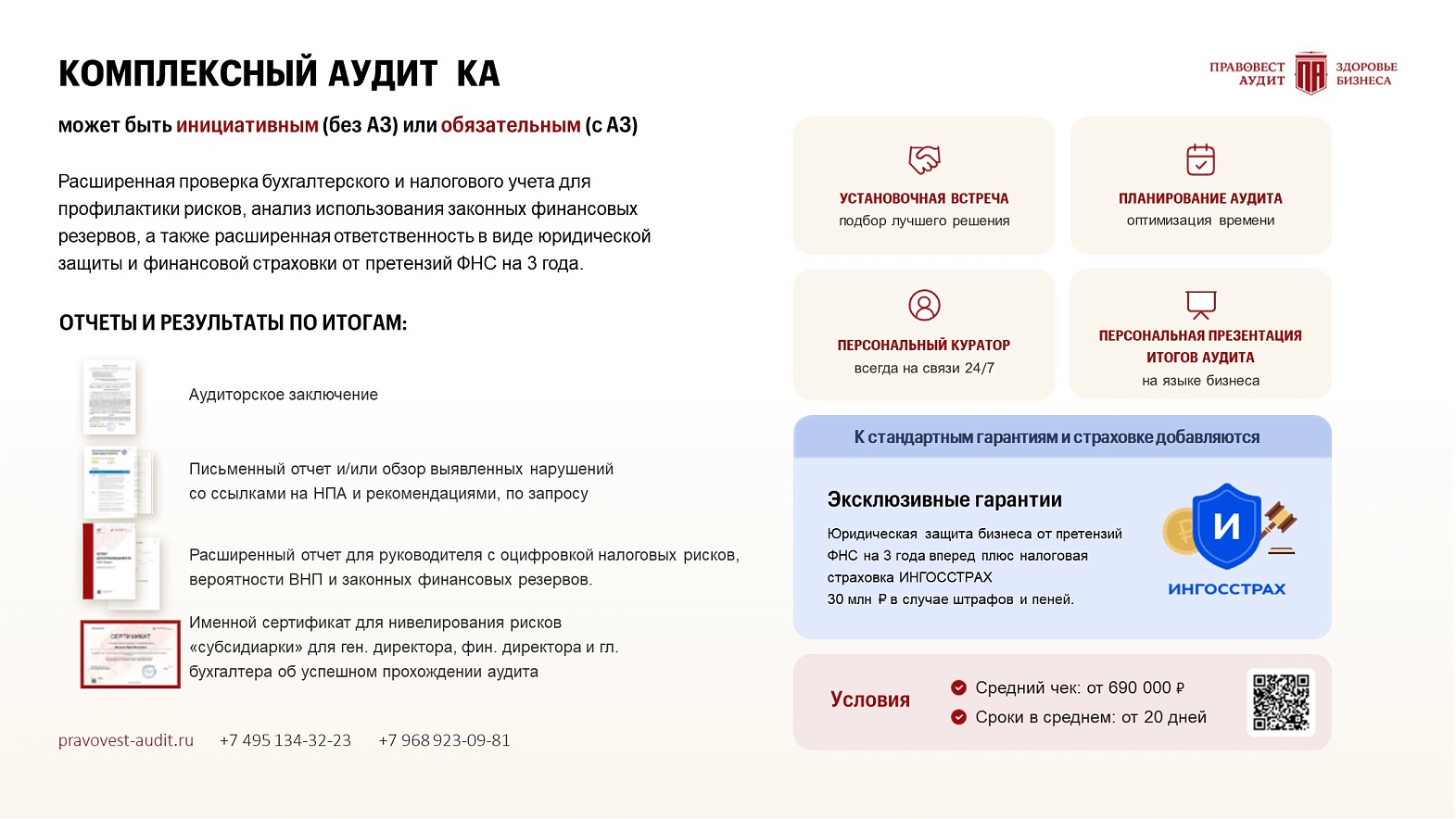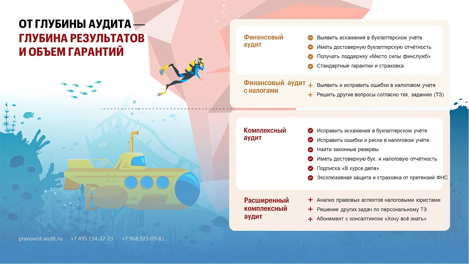 Поэтому большинство клиентов «Правовест Аудит» выбирают аудит на результат — комплексный аудит — с углубленной проверкой налогового учета вместе с уникальной юридической защитой и гарантиями: страховкой от налоговых претензий. Также за последние несколько лет выросла доля инициативного налогового аудита, поскольку компании, не подлежащие обязательному аудиту, тоже желают знать о всех возможных налоговых рисках и, что важно, раскрыть для себя возможность использования законных преференций и финансовых резервов, а также «застраховаться» от налоговых претензий.