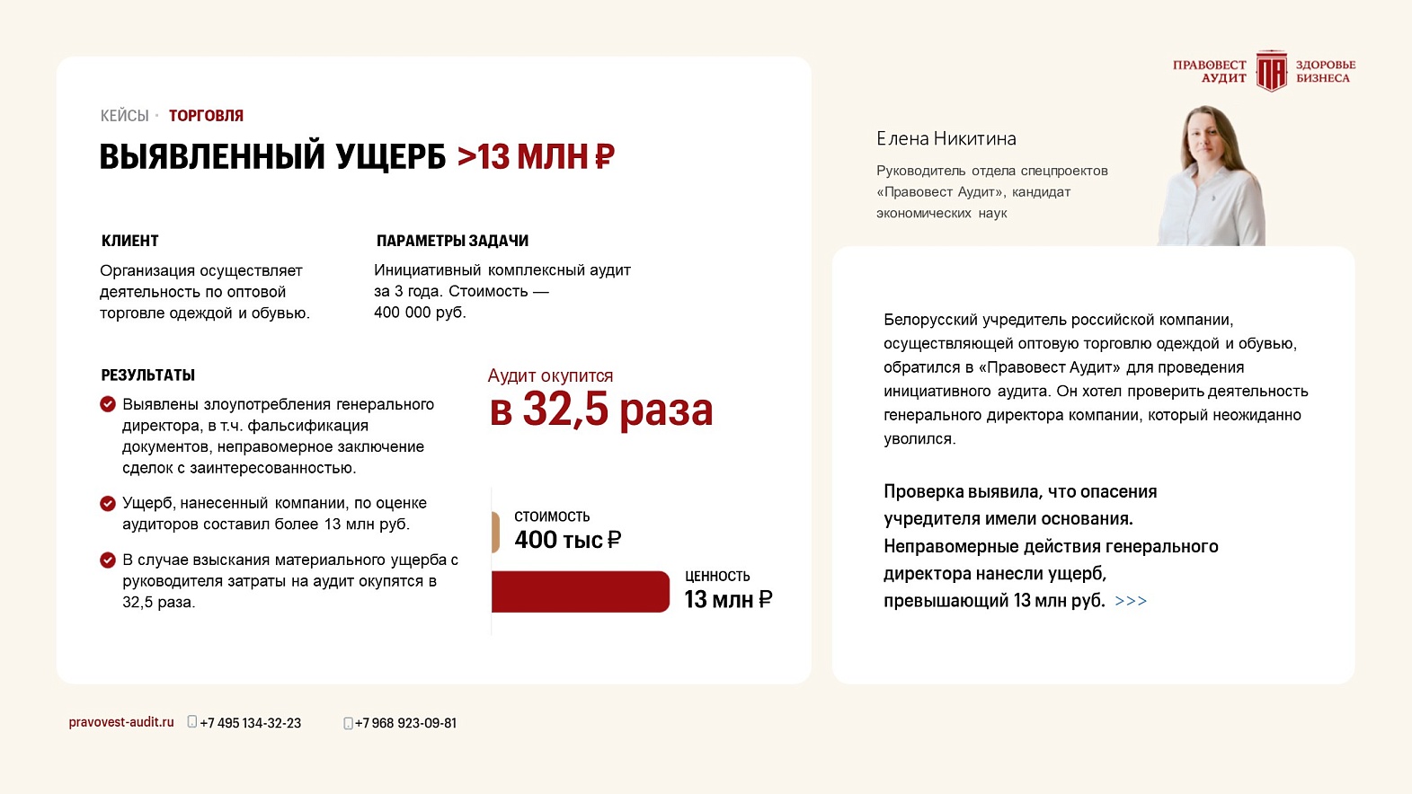 Экономия на аудите — риск потери десятков миллионов рублей, которые затрагивают не только компанию, но и личные интересы собственников, генерального и финансового директора, главного бухгалтера.