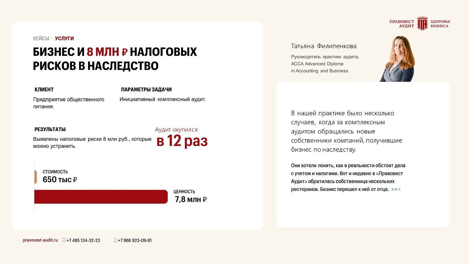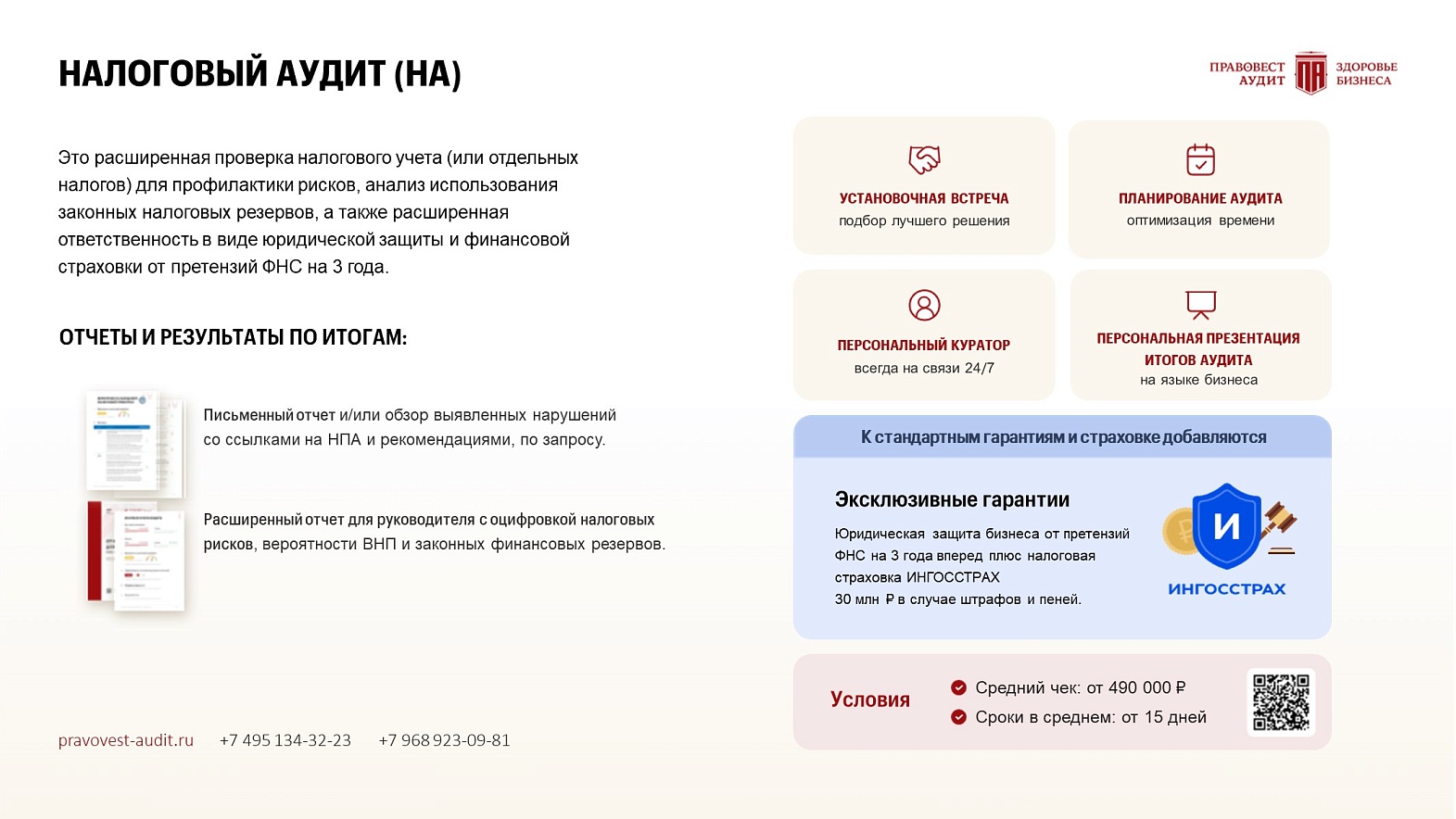 «Правовест Аудит» — первая и единственная компания, которая предоставляет расширенные гарантии и защиту от налоговых и субсидиарных рисков вместе с эксклюзивной страховкой ИНГОССТРАХ. И страховка реально работает! Клиент «Правовест Аудит» получил по страховке от налоговых претензий — 2,8 млн руб. без судебного разбирательства: подробности >>