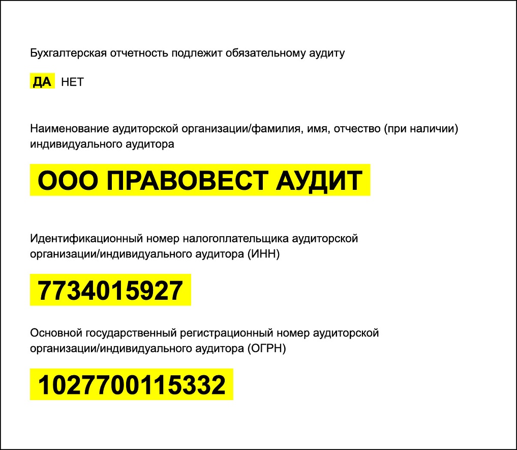Когда бухгалтерская отчетность организации подлежит обязательному аудиту, в заголовочной части бухгалтерского баланса раскрываются: наименование аудиторской организации, ее ИНН и ОГРН. Если аудит проводил аудитор — индивидуальный предприниматель раскрываются его ФИО, ИНН, ОГРНИП.