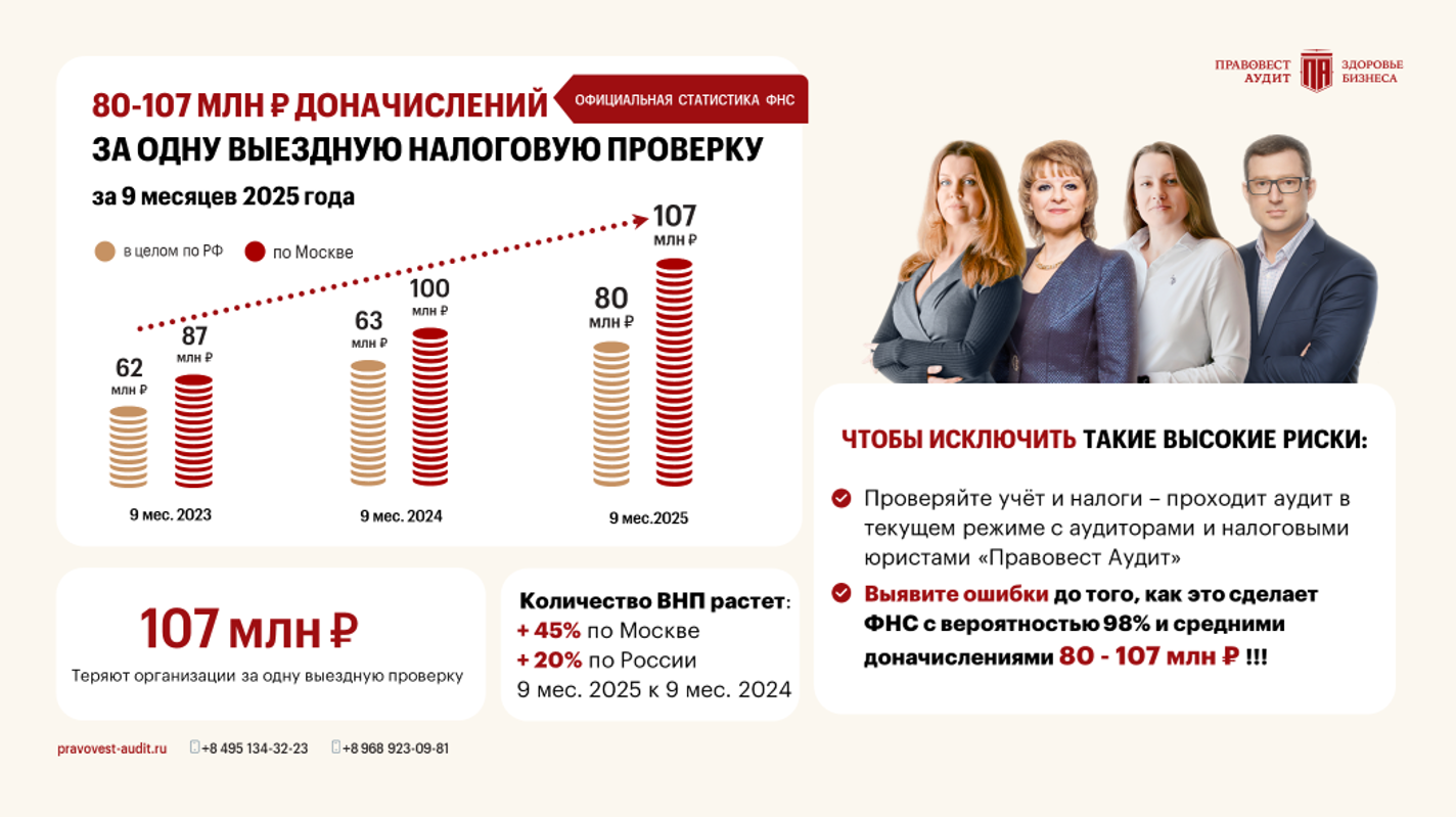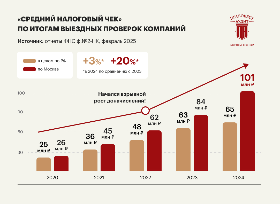Средний чек по итогам выездных налоговых проверок организаций продолжает расти. В 2025 году он составил в целом по РФ 80 млн руб., по Москве — 107 млн. руб.