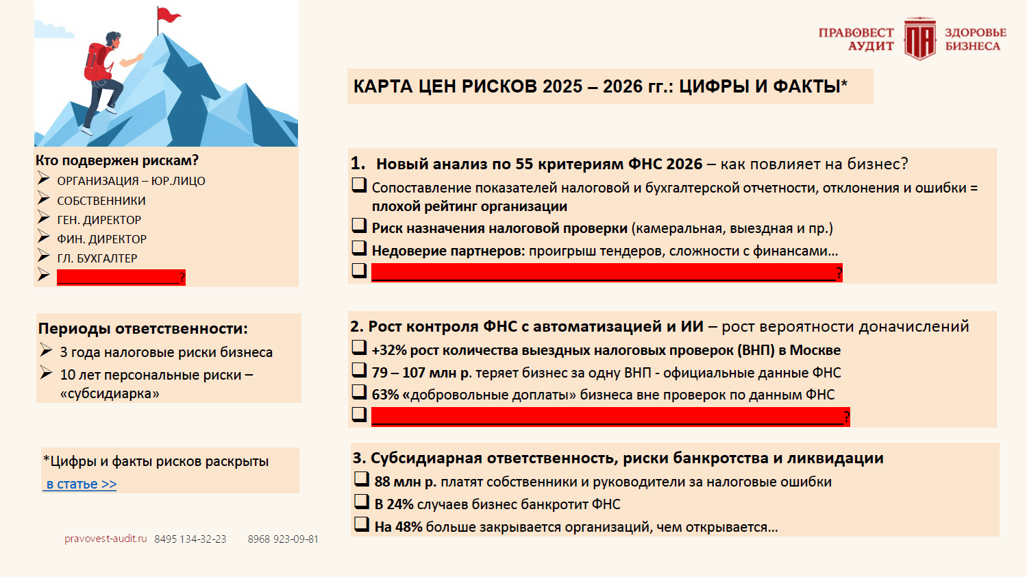 Кстати, с 01.01.2026 года налоговые органы наделяются полномочием представлять по запросу любого заинтересованного лица результат оценки финансово-хозяйственной деятельности организации или ИП, основанной на подтверждении соответствия показателей бухгалтерской и налоговой отчетности и иных имеющихся у налоговых органов сведений определенным критериям (Федеральный закон от 23.07.2025 № 254-ФЗ). Информация бухгалтерской и налоговой отчетности становится прозрачной — каждая компания должна быть уверена, что отчетность не содержит ошибок. Отклонения, которые ранее могли оставаться незамеченными, с 2026 года станут важным публичным фактором оценки надежности бизнеса. Недостоверная отчетность может испортить репутацию компании, и напротив, «положительные» показатели в оценке ФНС будут являться определенным конкурентным преимуществом налогоплательщика. Аудит помогает навести порядок в учете и отчетности, держать важные зоны под контролем чтобы избежать рисков финансовых потерь. Подробнее в