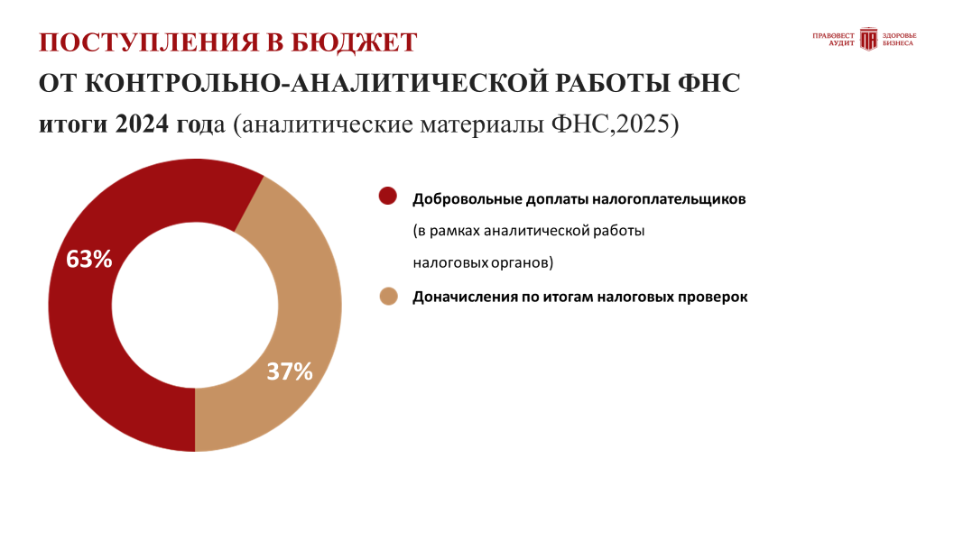 Тенденция 2025 — рост поступлений налогов в бюджет за счет «добровольных доплат» компаниями после получения информационного письма о порочности контрагентов, визита руководителя в инспекцию «на разговор» (сомнительные контрагенты, «дробление бизнеса», низкая «официальная» зарплата и пр.).