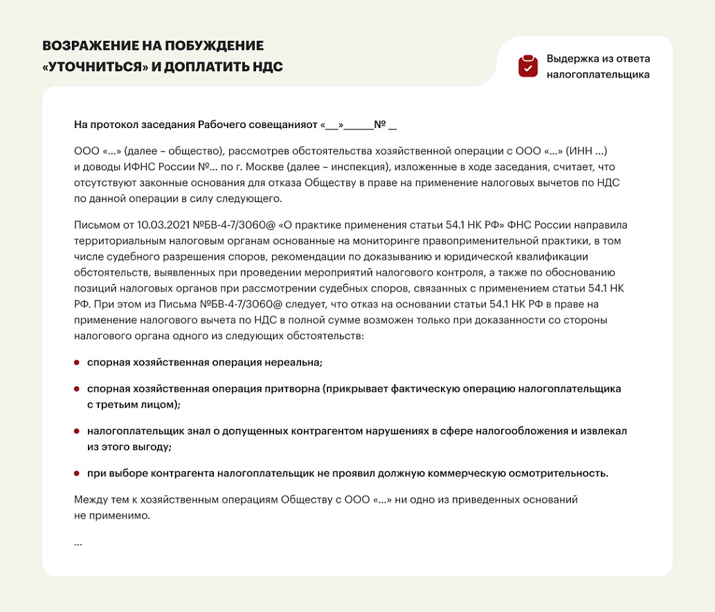 - Если оснований для «уточнений» налоговых обязательств нет — подготовить и направить в инспекцию письменные возражения на протокол «заседания рабочей группы».