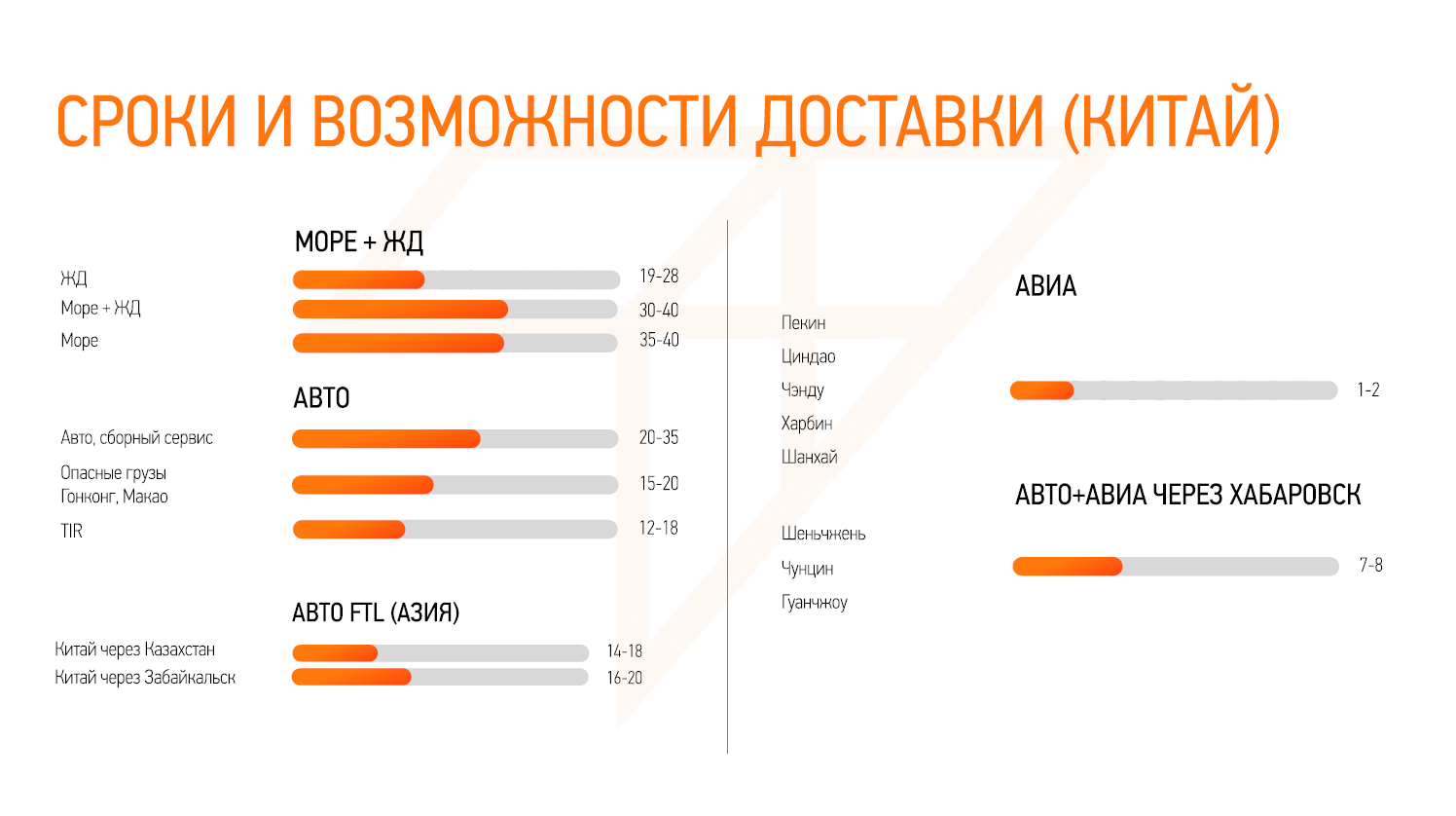 - Море или Ж/Д: подходят для долгосрочного планирования и неспешных закупок (30-40 дней).