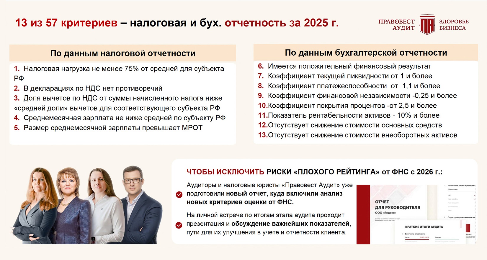 - Какая аудиторская фирма реально сведёт для вас к нулю риски налоговых доначислений, неблагоприятного публичного ЭКГ-рейтинга и низкой оценки ФНС по 13 из 57 критериев?