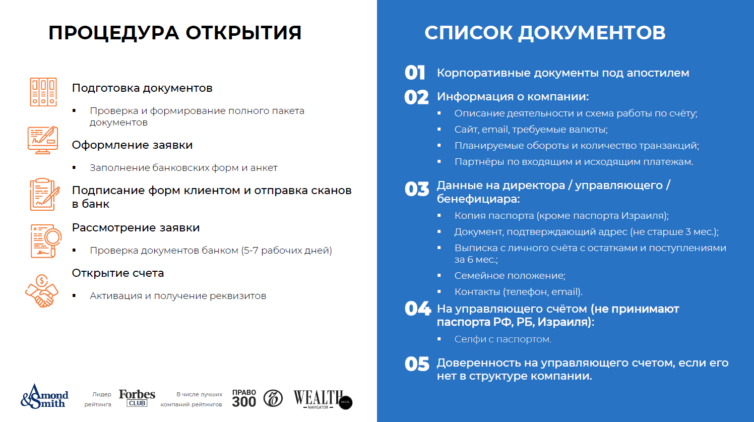 Процедура открытия счета достаточно стандартна и может проводиться полностью дистанционно. Из документов требуются корпоративные документы на компанию, а также стандартный KYC-пакет на директора и бенефициара. Примечательным плюсом является то, что для компаний из ОАЭ не требуется дорогостоящая легализация документов, что позволяет сэкономить 8-10 тысяч долларов.