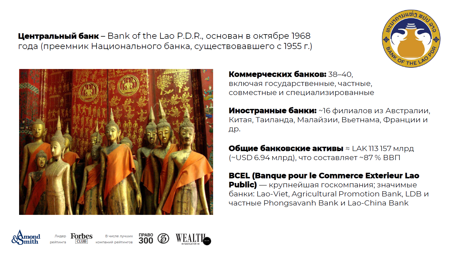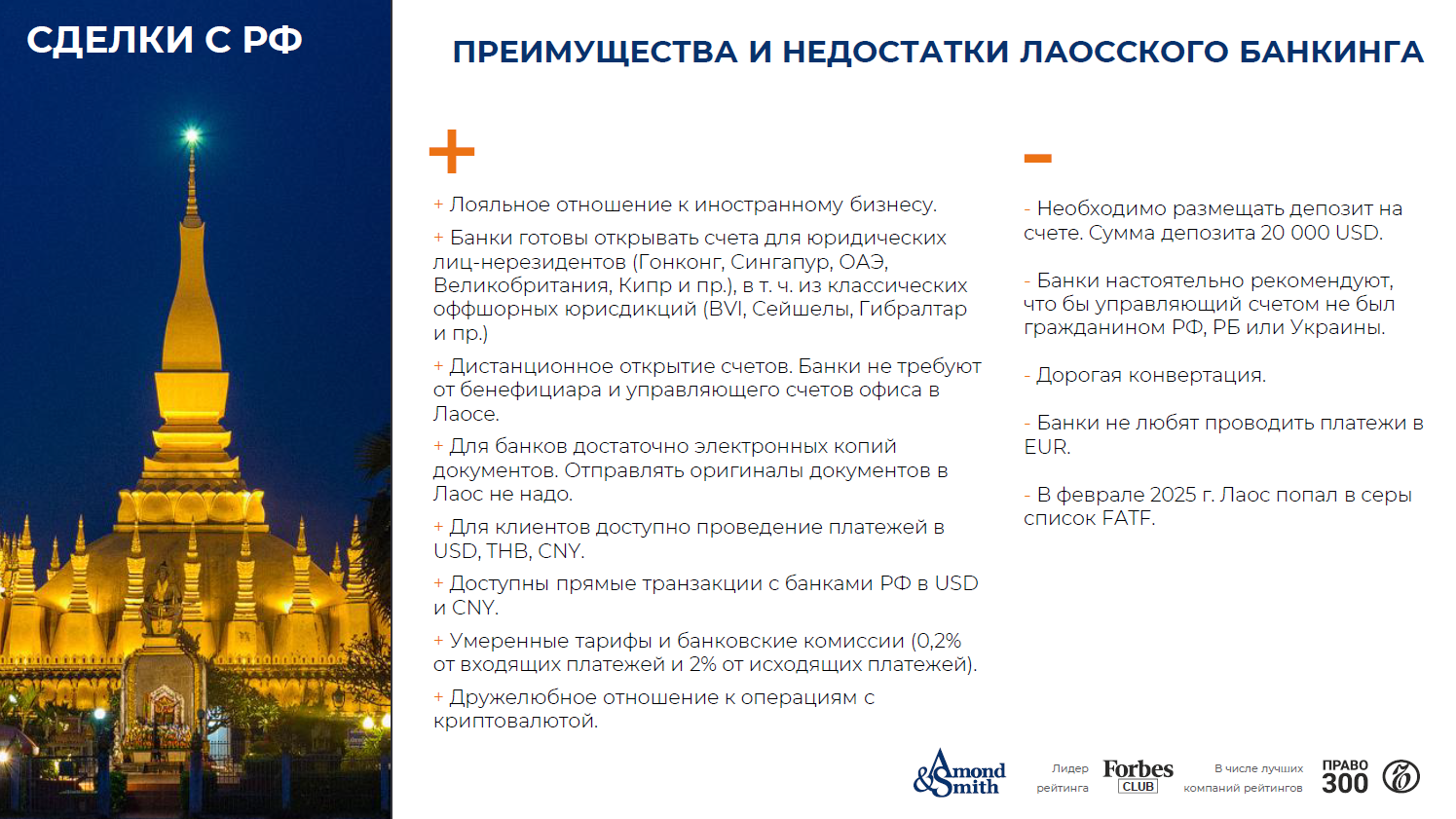 Ключевым преимуществом лаосского банкинга, по словам Ивана Тихоненка, является возможностьть взаимодействия с рядом российских банков. Это позволяет осуществлять транзакции из России в Лаос и обратно в двух валютах: китайских юанях и долларах США. Существует практика открытия счетов в Лаосе непосредственно на российские компании.