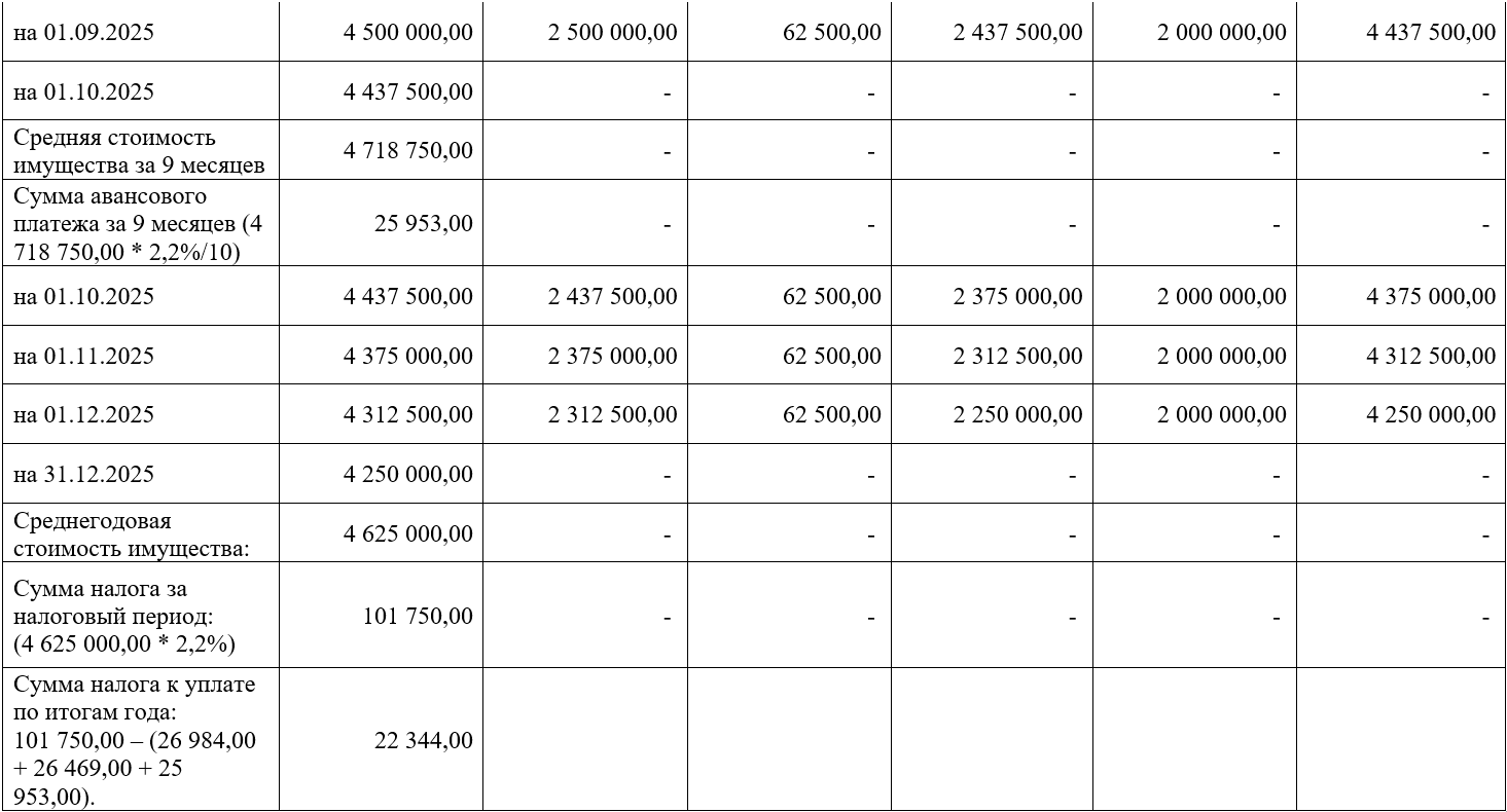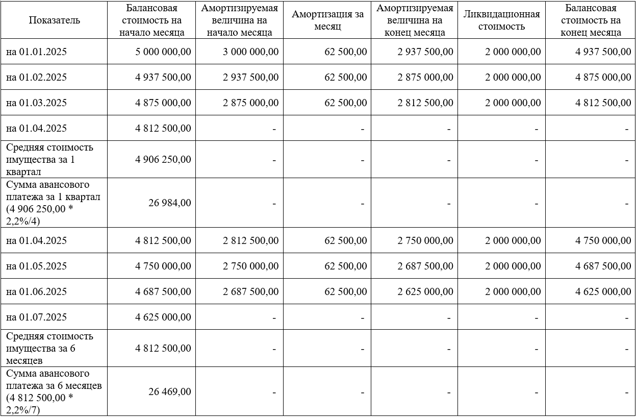 Общество произвело неотделимые улучшения арендованного здания в декабре 2024 года стоимостью 5 000 000 руб. Срок полезного использования неотделимых улучшений равняется оставшемуся сроку аренды, и составляет 4 года (подп. «а» п. 9 ФСБУ 6/2020). Амортизация неотделимых улучшений начинает начисляться с 01.01.2025 (п. 33 ФСБУ 6/2020). Ликвидационная стоимость неотделимых улучшений равняется величине их возмещения арендодателем и составляет 2 000 000 руб. Соответственно, амортизируемая величина равняется 3 000 000 руб. (5 000 000 — 2 000 000) (п. 30 ФСБУ 6/2020). Сумма ежемесячной амортизации составит 62 500 руб. (3 000 000 / 48 мес.). Ставка налога на имущество — 2,2%. Тогда, сумма налога и авансовых платежей за 2025 год составит: