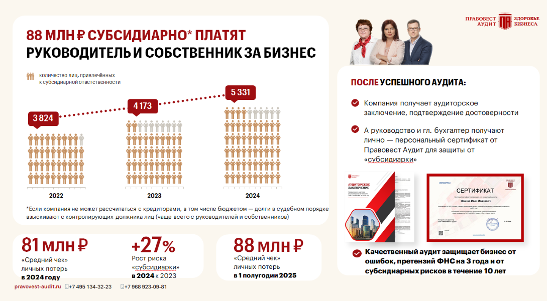 «Средний чек» субсидиарной ответственности в 2025 году составил 88 млн руб., за 2024 год — 81 млн руб. (по данным Федресурса).