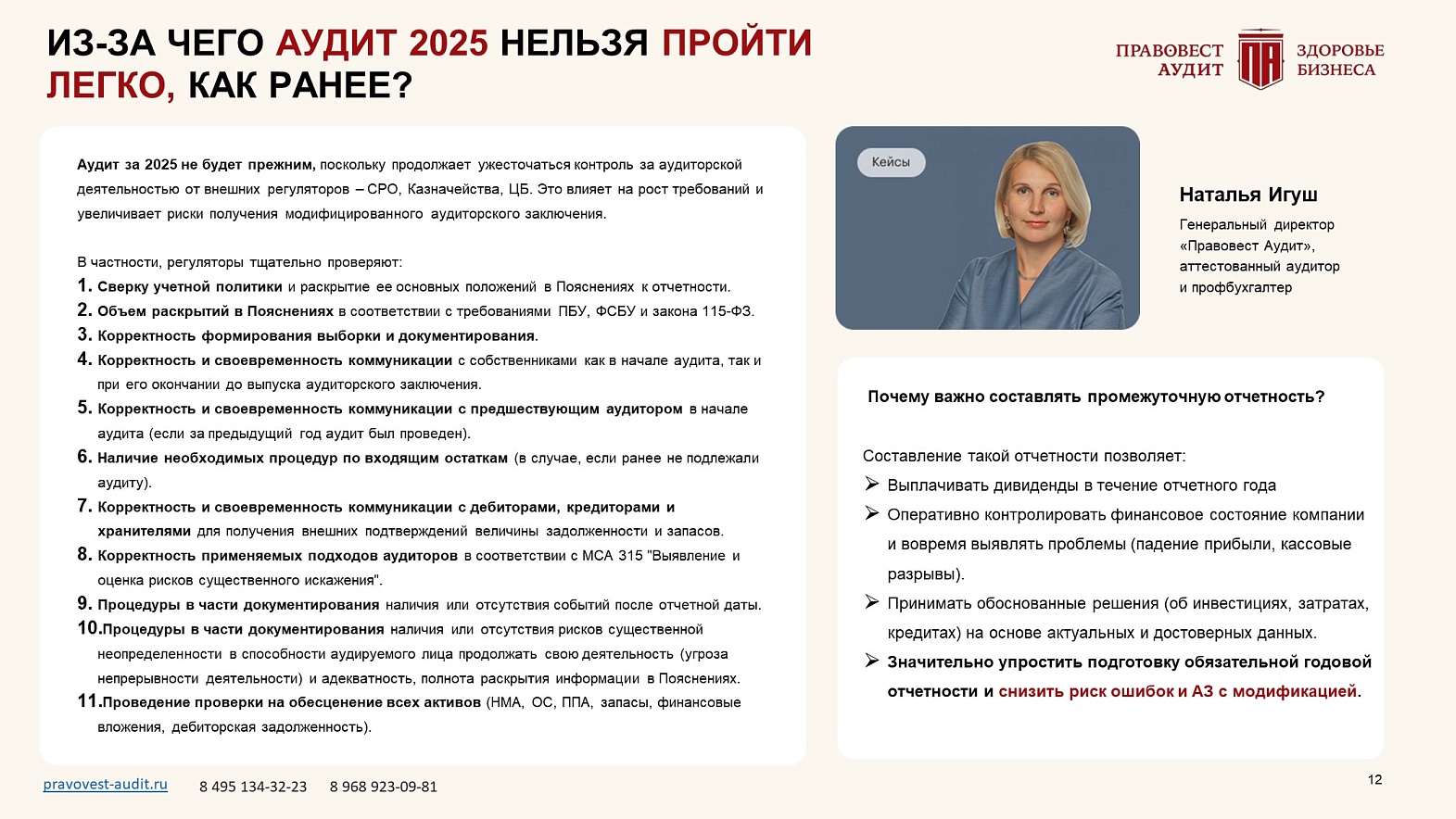 Важно отметить, что аудит за 2025 не будет прежним, поскольку продолжает ужесточаться контроль за аудиторской деятельностью от внешних регуляторов - СРО, Казначейства, ЦБ. Это напрямую влияет на рост требований, предъявляемых аудиторами к клиентам, и увеличивает риски получения модифицированного аудиторского заключения.