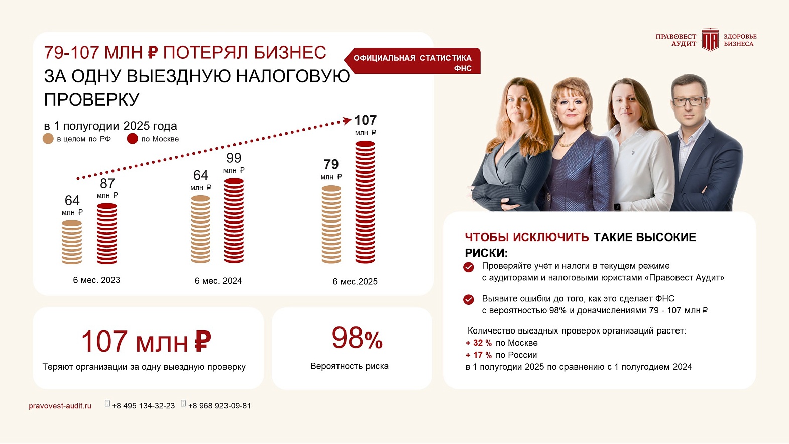 Средний чек по итогам выездных налоговых проверок организаций продолжает расти. За 9 месяцев 2025 года его размер достиг в целом по РФ 80 млн руб., по Москве - 107 млн. руб.