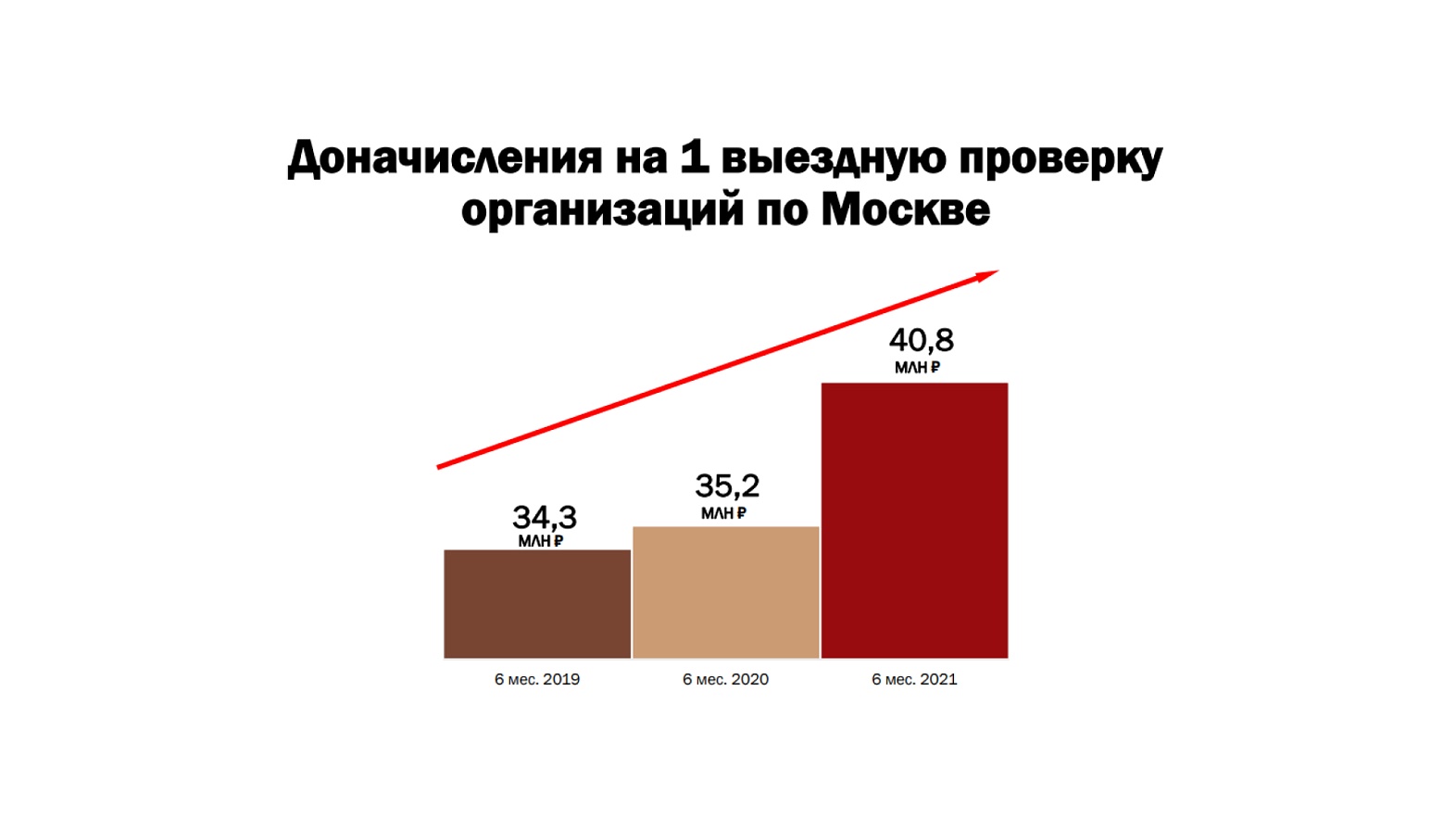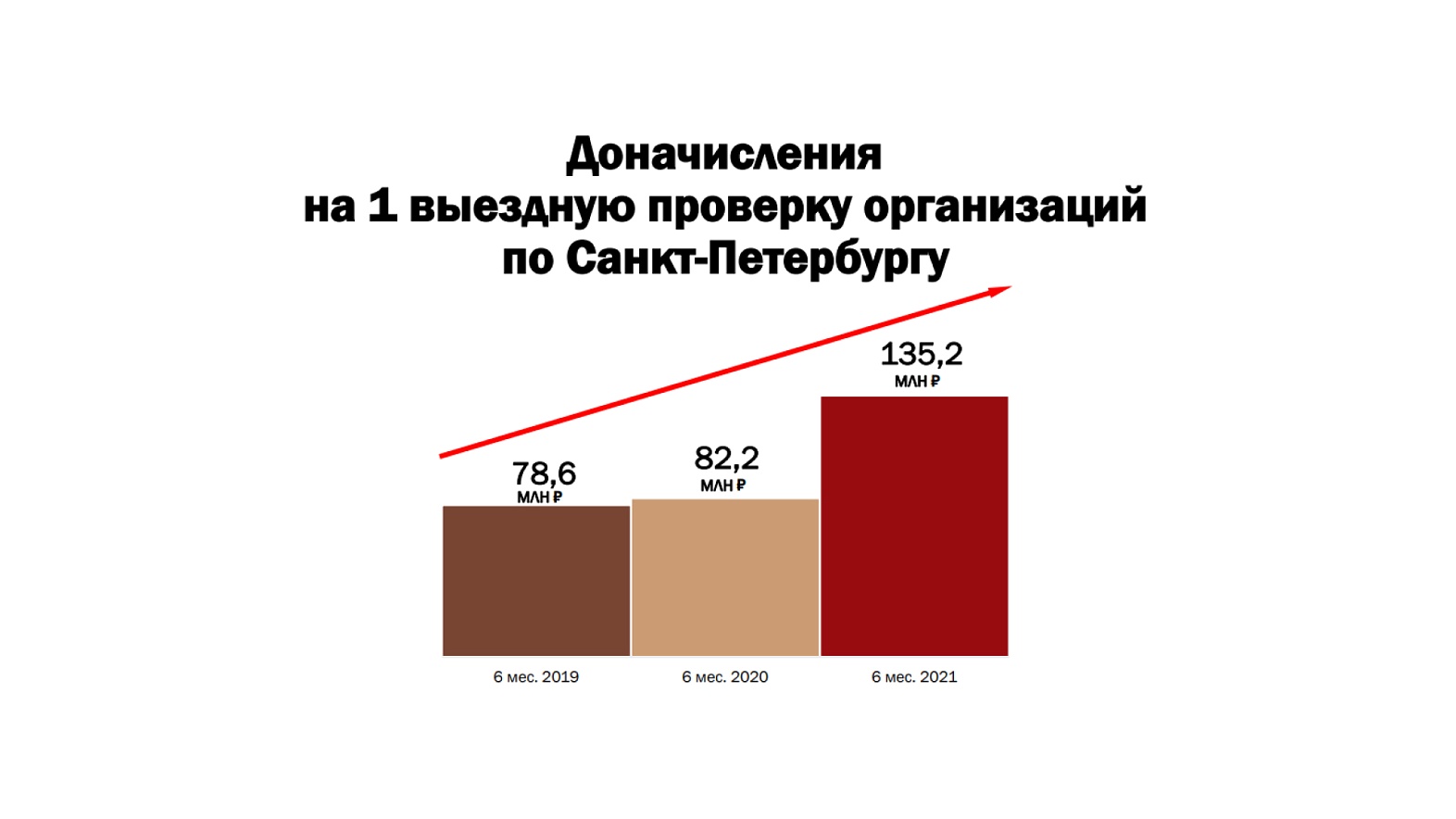 За тот же период 2019 года было проведено 4 408 проверок, результатом 4 266 проверок стали доначисления на общую сумму 106,9 млн руб. (налоги — 77,8 млн руб.) и доначисления на 1 проверку составили — 25 млн руб.