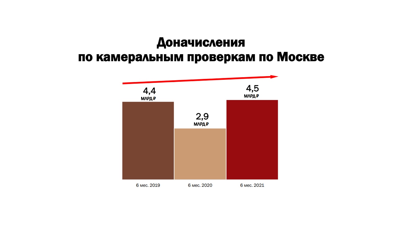 За 1-е полугодие 2019 года проведена 51 проверка, 49 из них принесли доначисления в общем размере 3,9 млрд руб. (налоги — 2,7 млрд руб.). За этот же период 2020 года — 17 проверок и все с доначислениями в общем размере 1,4 млрд руб. (налоги — 0,9 млрд руб.).
