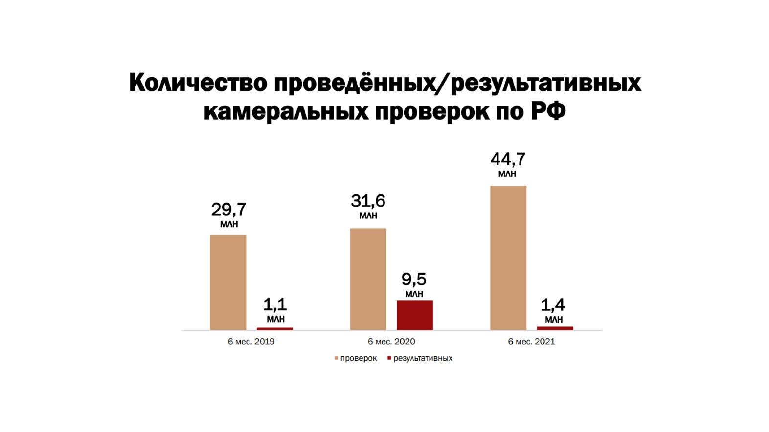 За 1-е полугодие 2021 года по России в целом проведено 44,7 млн проверок, из них результативных — 1,4 млн проверок, с доначислениями на общую сумму 34,4 млрд руб. (налог, пени, штраф), в т.ч. налоги — 21,3 млрд руб. За аналогичные периоды: