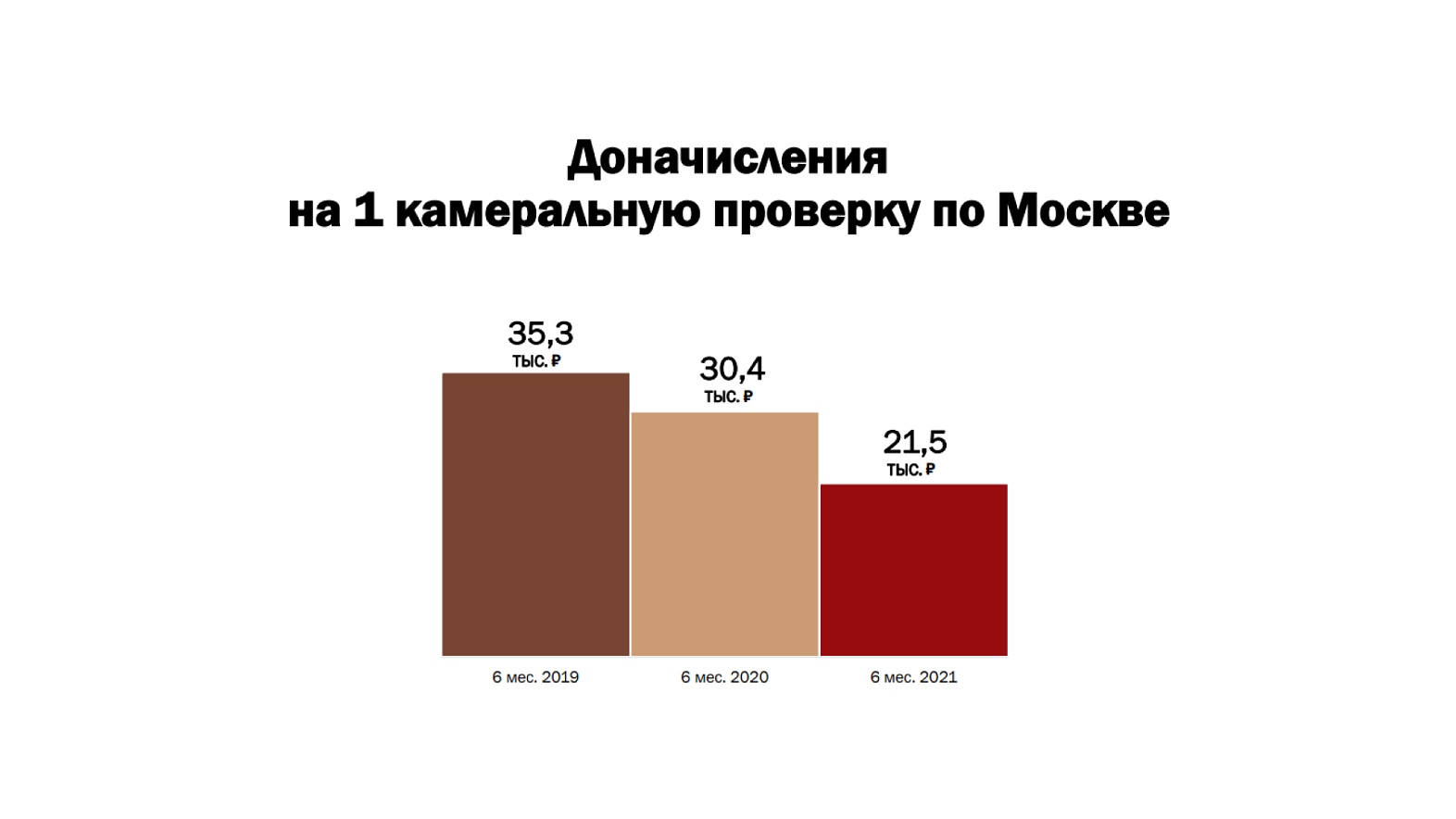 Что касается суммы доначислений по Москве на 1 камеральную проверку за 6 мес. 2021 года, то ее размер составил — 21,5 тыс. руб. (налог, пени, штраф), за аналогичный период 2020 года — 30,4 тыс. руб., в 2019 году — 35,3 тыс. руб.
