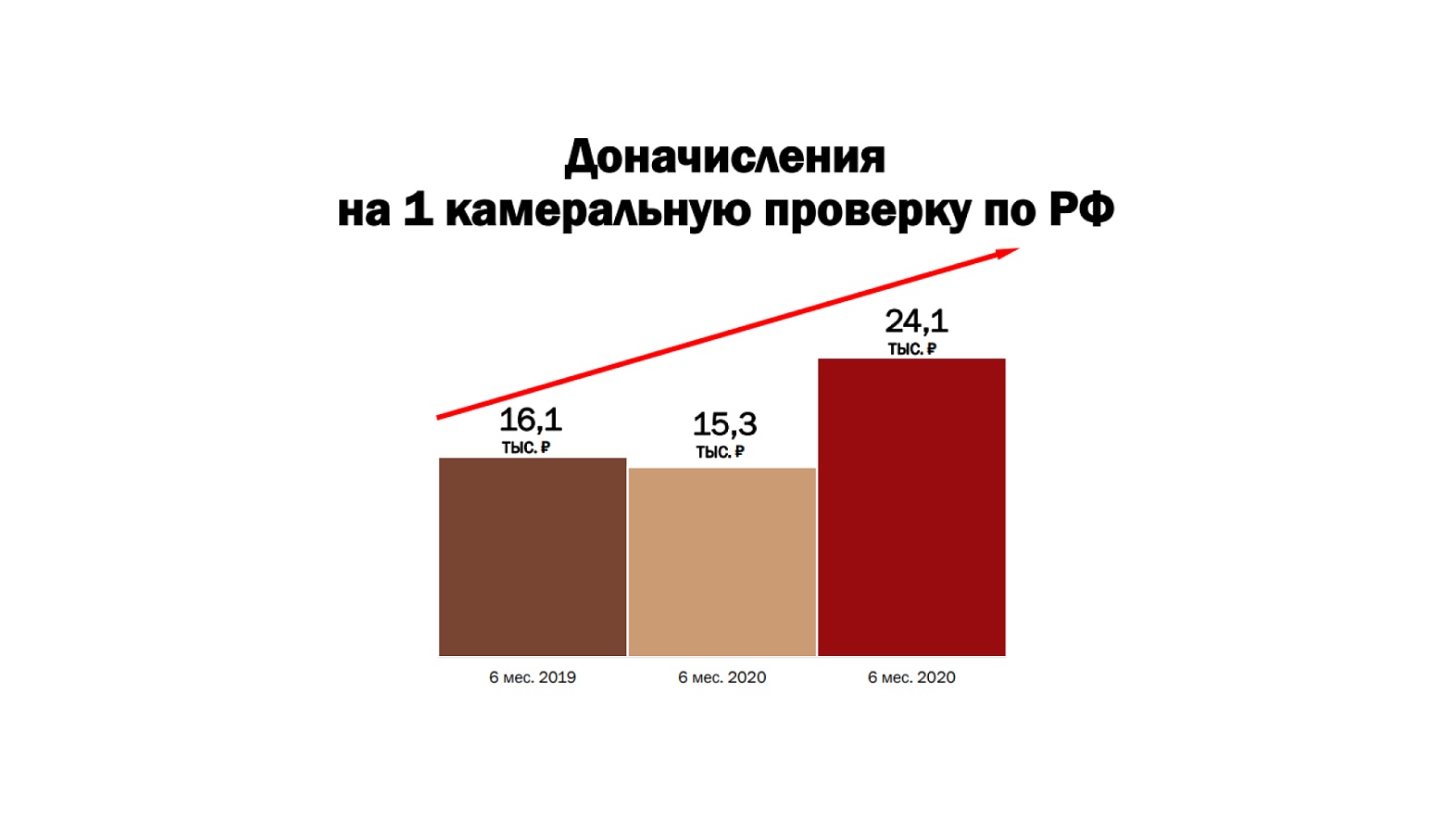 В 2020 году за 6 месяцев проведено 1 535 проверок, из них результативных — 1 486 на общую сумму доначислений 44,8 млрд руб. (31,5 млрд руб. — налоги) или в среднем 30,2 млн руб. доначислений на 1 проверку.