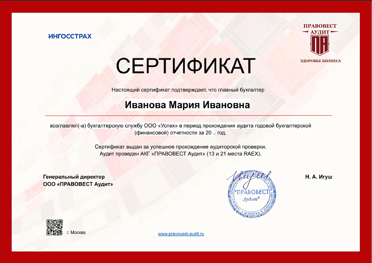 Важно, что «Правовест Аудит» вместе с аудиторским заключением выдает персональный сертификат главному бухгалтеру. Который свидетельствует, что он успешно прошел аудиторскую проверку, компания получила положительное аудиторское заключение, что подтверждает достоверность учета. И даже если вы уволитесь, у вас лично остается этот сертификат, подтверждающий факт, что вы, выполняя должностные обязанности главного бухгалтера в конкретной компании имеете документальное подтверждение от аудиторской компании, что вы добросовестно соблюдали все основные требования законодательства и учет был достоверен. Сертификат лучше хранить, он может пригодиться, чтобы защитить вас от субсидиарной ответственности. Например, главный бухгалтер исполнял свои должностные обязанности, компания проходила ежегодный аудит. Спустя какое-то время пытаются доказать, что он вел учет неправильно, из-за этого возникли налоговые ошибки, неуплата налогов, доначисления и пр., будут пытаться привлечь его к субсидиарной ответственности по налоговым долгам компании-должника вместе с руководителем. Тут бухгалтеру может пригодиться такой персональный сертификат от аудиторской компании вместе с аудиторским заключением.