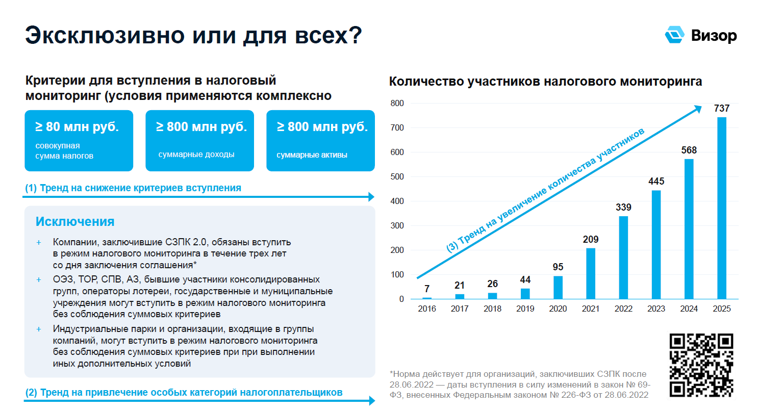Изначально налоговый мониторинг позиционировался как режим для крупнейших налогоплательщиков, но государство последовательно снижает порог вхождения. Если несколько лет назад критерии по выручке и активам составляли миллиарды рублей, то сейчас для вступления в НМ компания должна удовлетворять трем условиям: уплаченные налоги за год — более 80 млн рублей, а суммарные доходы и активы — более 800 млн рублей каждый. Потенциально под эти критерии уже сейчас подпадают более 13 тысяч российских компаний.