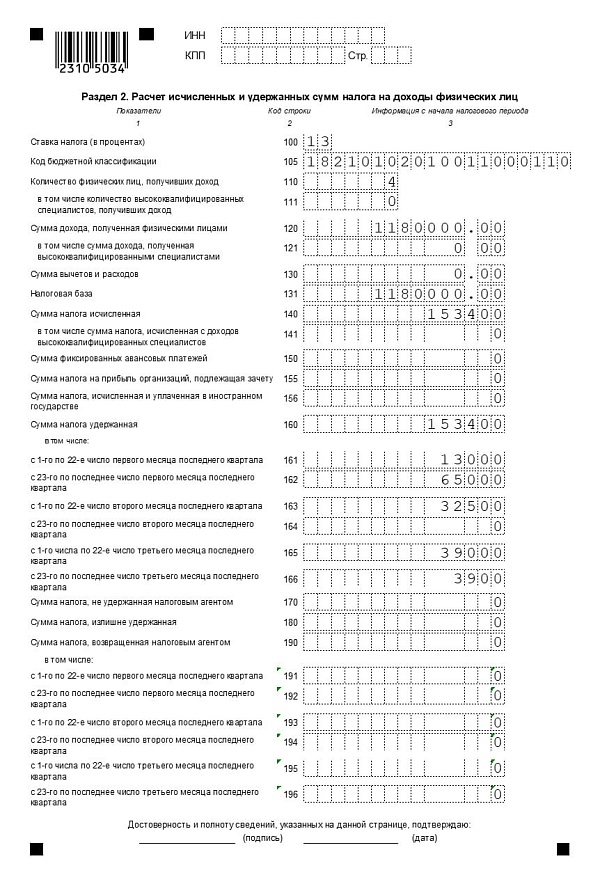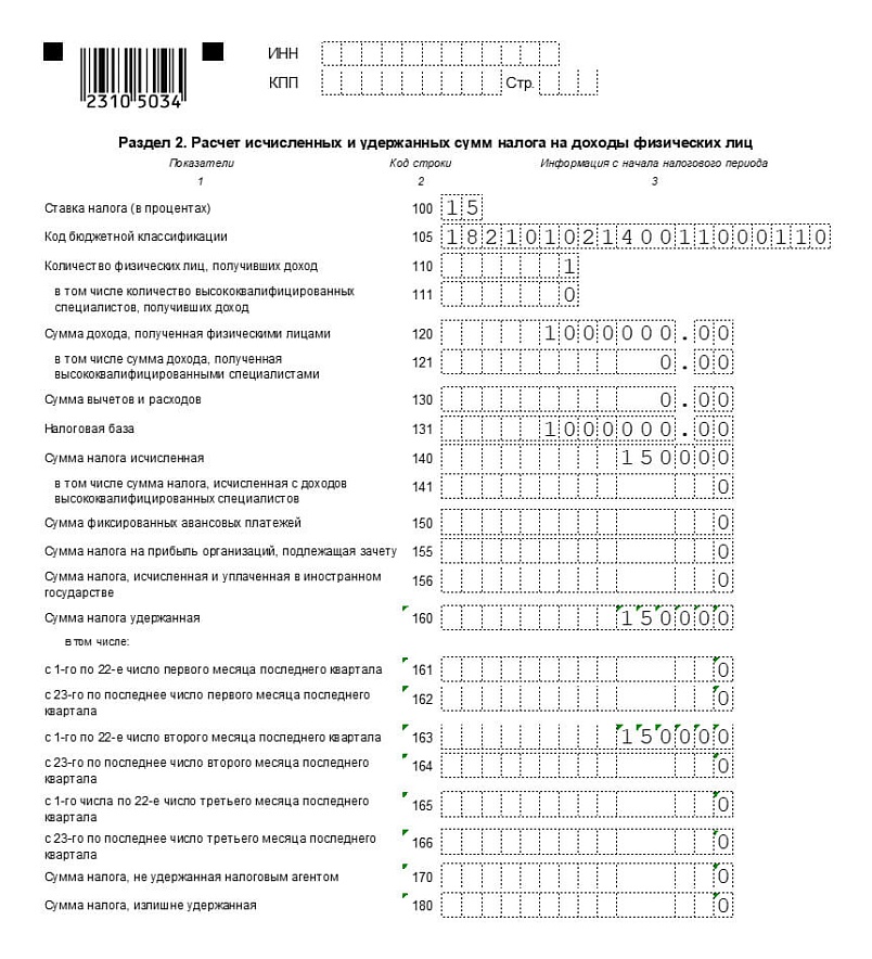 В Разделе 2 определяется база для исчисления и удержания НДФЛ, исчисляется налог и указывается удержанный. Формируется Раздел 2 формы 6-НДФЛ нарастающим итогом с начала года. В отличии от старого порядка заполнения Раздела 2, в новой форме 6-НДФЛ удержанная сумма НДФЛ по стр.160 и возвращенная сумма НДФЛ по стр. 190 детализируется за последний квартал по срокам перечисления.