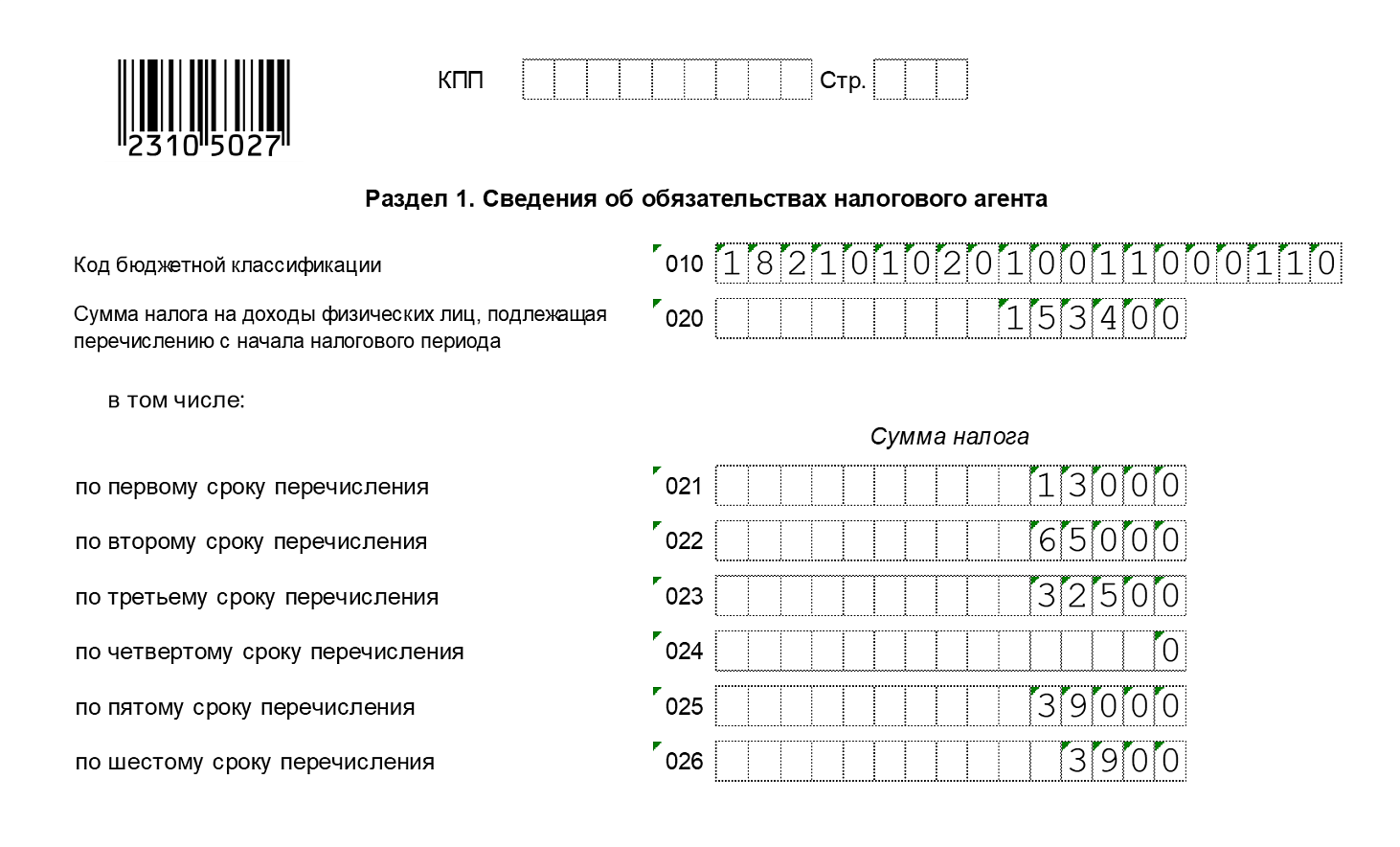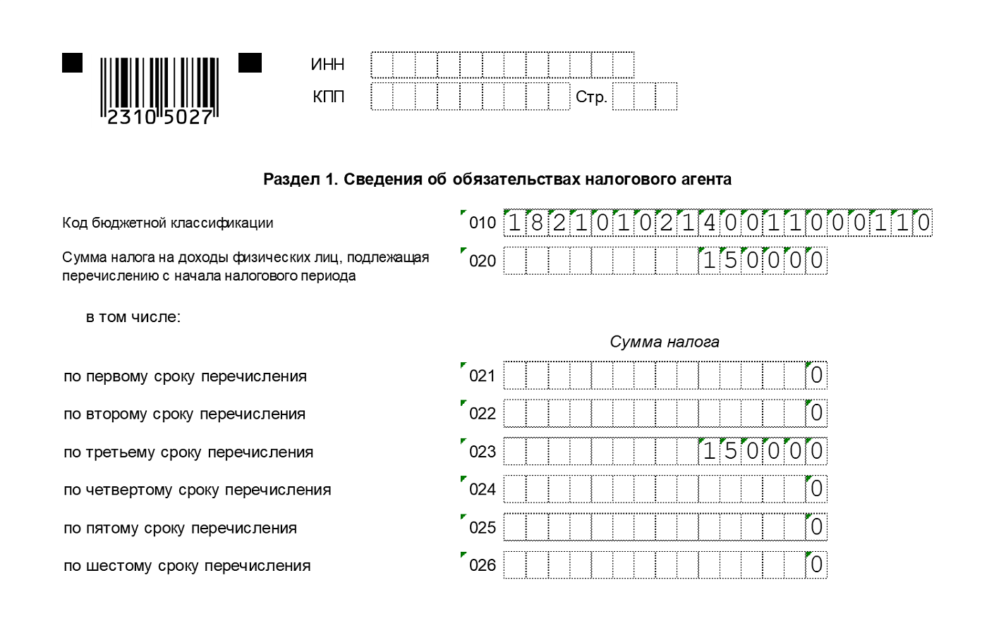 В первом разделе отражаются обобщённые данные об обязательствах по уплате НДФЛ налоговым агентом.