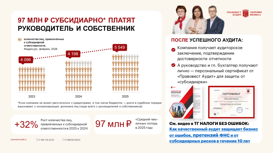 - Увеличилось количество лиц, привлекаемых к субсидиарной ответственности. Так, по итогам 2025 года к «субсидиарке» привлечено 5549 лиц, что на 32% больше 2024 года.