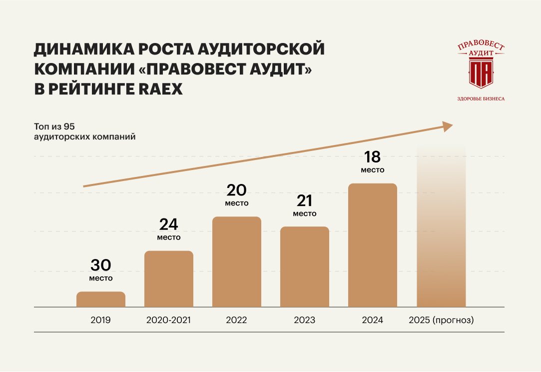Рост «Правовест Аудит» в рейтинге — не случайный, это планомерное движение к вершине. По сравнению с 2023 годом, наша компания переместилась сразу на 3 позиции вверх, по сравнению с 2020 — на 13.