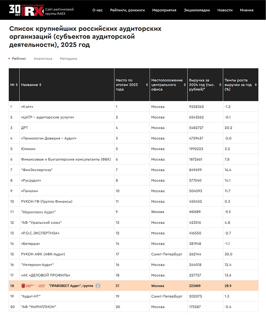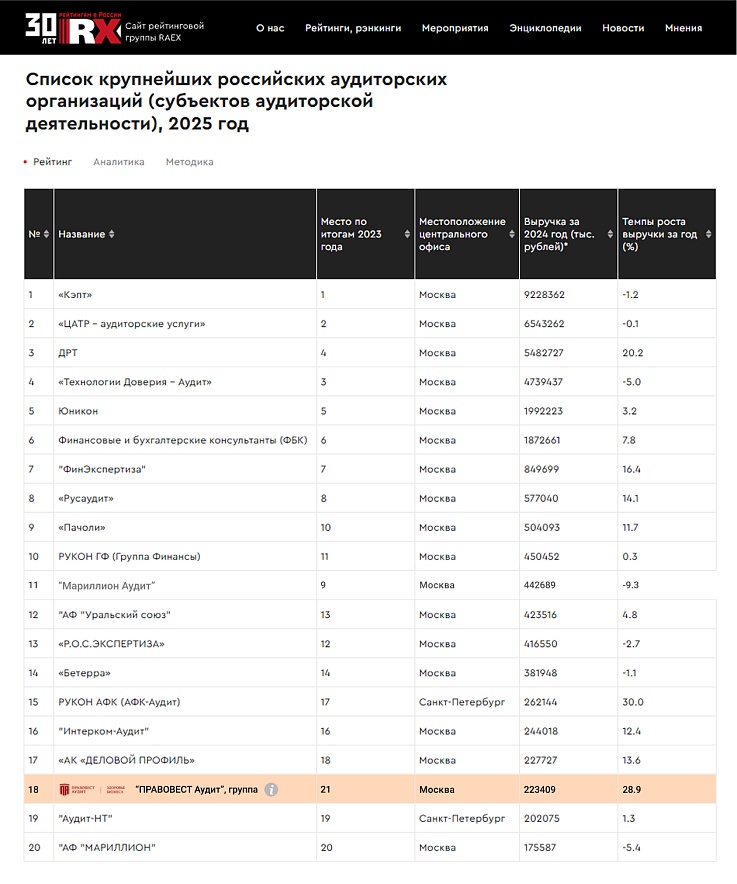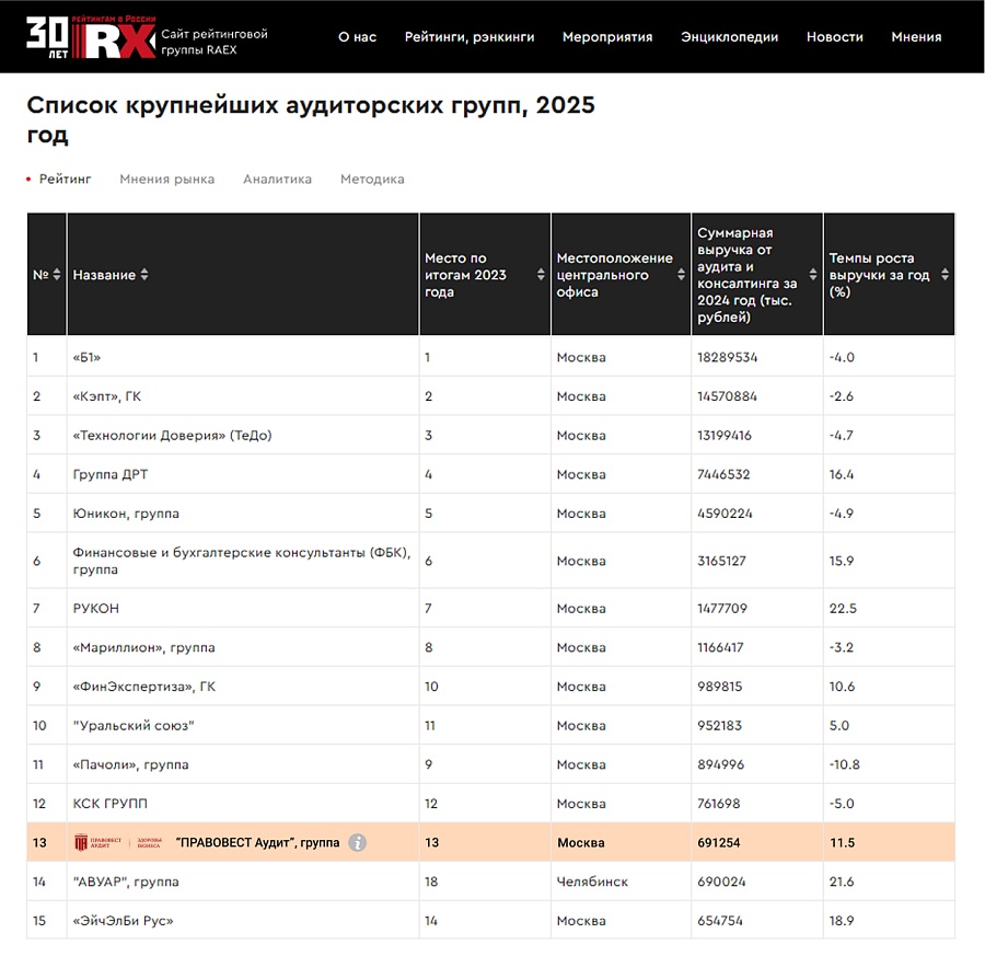 В рэнкинге аудиторских компаний, составленном АО «Эксперт Бизнес-Решения», «Правовест Аудит» в десятке лидеров по обязательному аудиту.