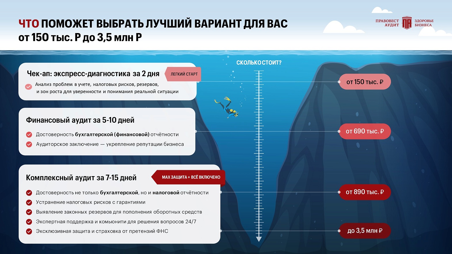 Доступность диагностики как по стоимости, так и по срокам проведения, открывает организациям по всей России возможность своевременного исправления ошибок в учете и налогах — это не формальность, а реальный способ сохранить устойчивость бизнеса, снизить налоговые риски и найти финансовые резервы.