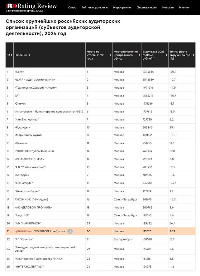 Аудиторская компания «Правовест Аудит» по итогам 2023 года заняла почетное 21-е место (из 96) в рейтинге крупнейших аудиторских компаний и показала прирост выручки на 20,7%.