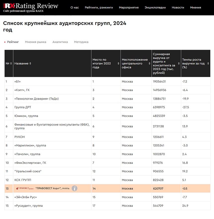 АКГ «Правовест Аудит», как группа, каждый год на позицию выше: 2020 — 16 место, 2021 — 15 место, 2022 — 14 место, 2023 — 13 место, несмотря на небольшое снижение выручки группы по итогам 2023 года (это общий тренд 2023 года).