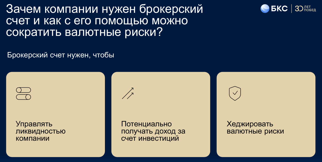 Также спикер рассказал участникам бизнес-встречи, зачем компании нужен брокерский счет, и как с его помощью можно сократить валютные риски.