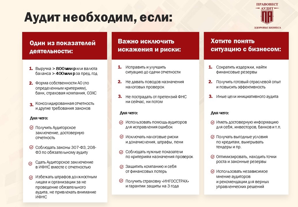 Т.е. подпадать под обязательную аудиторскую проверку могут и ООО. Например, если ценные бумаги фирмы участвуют в торгах или если доход, полученный от осуществления предпринимательской деятельности, составляет более 800 миллионов рублей или сумма активов бухгалтерского баланса по состоянию на конец года, непосредственно предшествовавшего отчетному году, составляет более 400 миллионов рублей, а также, если компании необходимо раскрыть сводную бухгалтерскую отчетность и т.д.