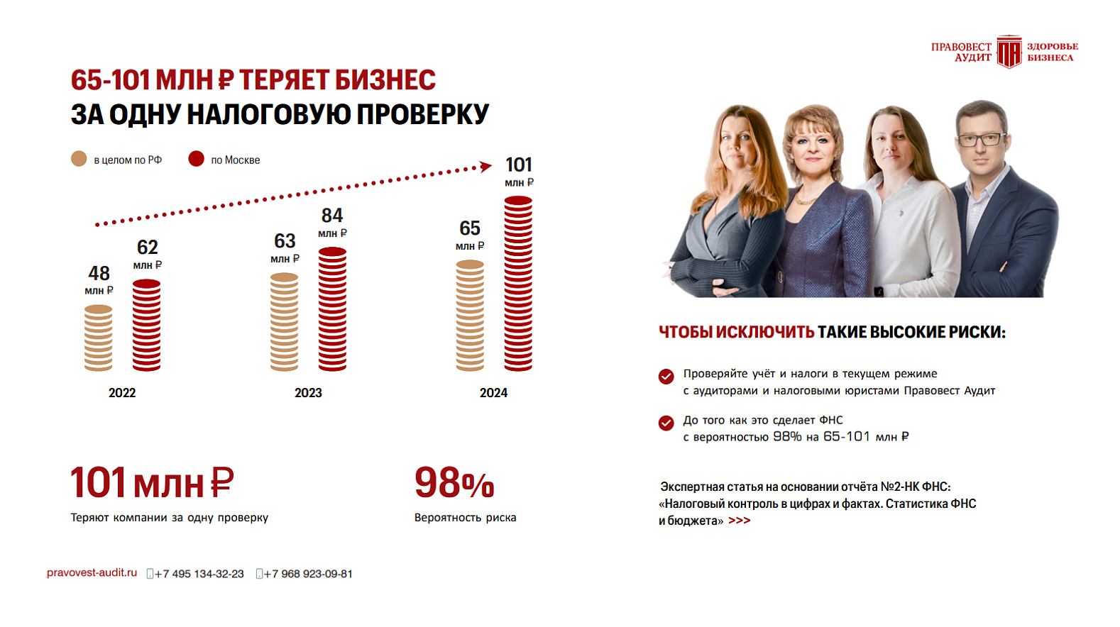 Но самые устрашающие последствия влечет отсутствие глубокой проверки налогов во время аудита. Законодательство не требует этого, однако тут кроется «ловушка», т.к. «стандартный» финансовый аудит практически не выявляет налоговые риски — он направлен на другое. И компании зачастую даже не подозревают, в какой опасности они находятся. Это выявляется только во время выездной налоговой проверки, которая по статистике влечет доначисления 65-101 млн руб. в 98% случаев... Особенно досадно, что таких катастрофических последствий можно было бы избежать, если ли бы компания провела , а значит риски были бы выявлены и обезврежены.