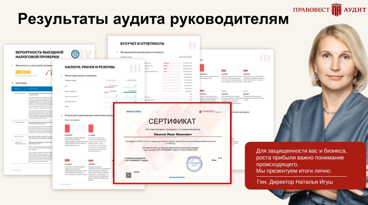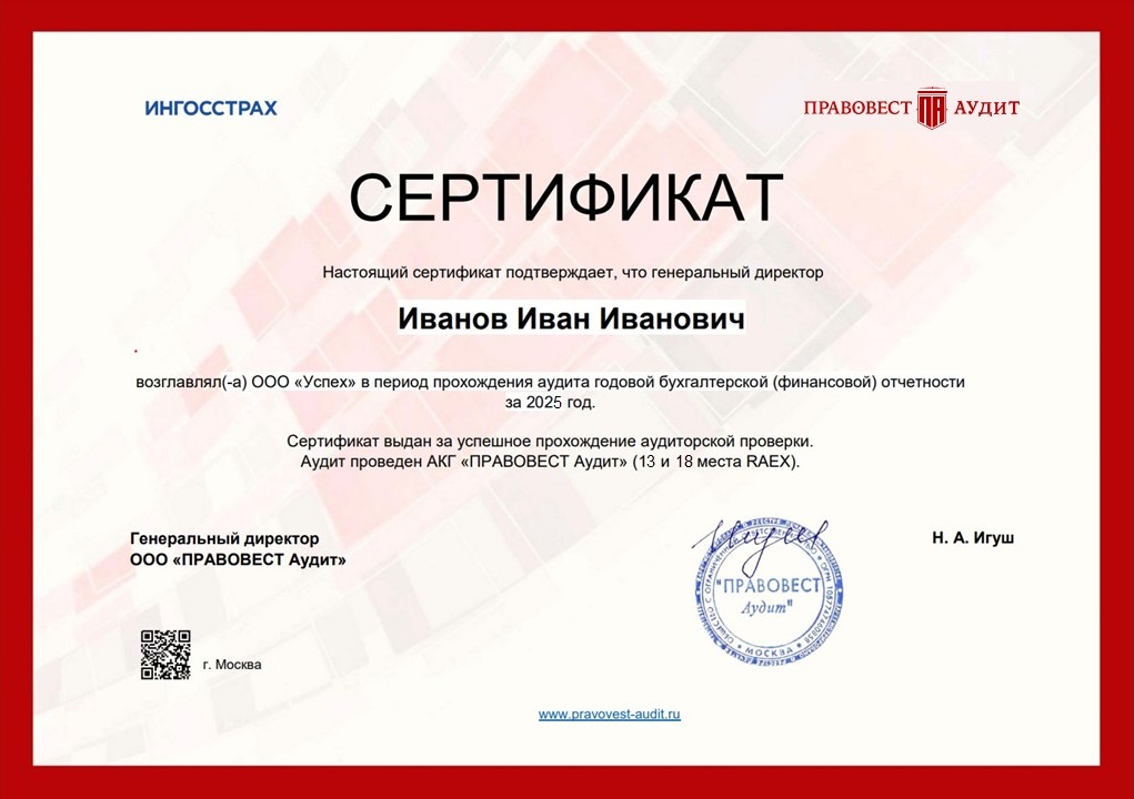 Чтобы дать дополнительную защиту руководителям и главным бухгалтерам от субсидиарной ответственности, «Правовест Аудит» по результатам успешной аудиторской проверки выдает Персональный сертификат о прохождении аудита.