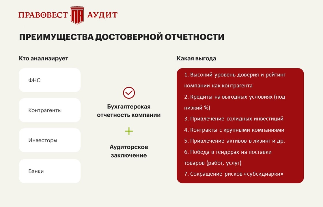 Есть и еще много «плюсов» от проведения аудита, например, финансовая отчетность вместе с аудиторским заключением вызывает больше доверия у собственников и инвесторов, для субсидий и побед на тендерах, при кредитовании в банках и т.п. А это дополнительные инвестиции в преимущества бизнеса.