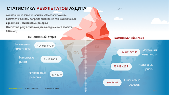 Итоги показали, что по выявлению налоговых рисков комплексный аудит с углубленной проверкой налогового учета более, чем в 22 раза эффективнее классического финансового аудита, а по выявленным налоговым резервам — почти в 6 раз. Т.е. при проведении комплексного аудита «с налогами» риски доначисления налогов сводятся к минимуму.