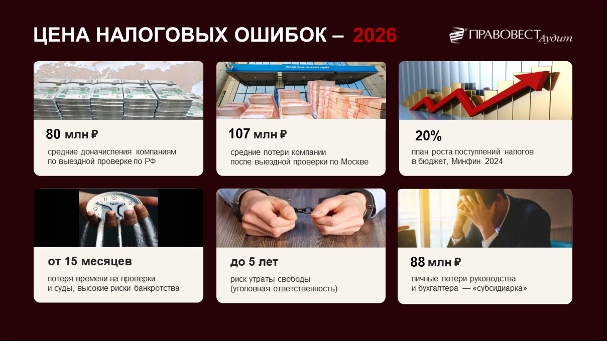 Как видно, налоговые ошибки стоят дорого и грозят компании, ее руководителям и собственникам не только финансовыми потерями, но и потерей времени, нервов, возможным приостановлением деятельности. Даже могут повлечь банкротство компании и потерю свободы руководителя/собственника в случае привлечения к уголовной ответственности.
